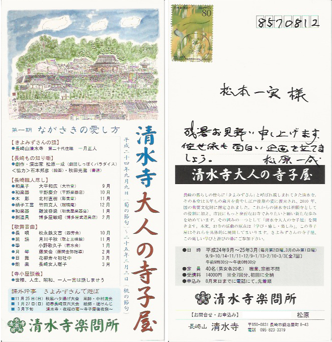 投稿日: 2012年8月16日 投稿者: admin清水寺大人の寺子屋 第一期 ながさきの愛し方 平成24年9月から25年3月まで 9/9,10/14,11/11,12/9,1/13,2/10,3/3(全7回) 定員 40名 職業や宗教不問 受講料 14,000円(全7回分、初回に前納) お申し込み 8月末日までに電話でお申し込みください。先着順です。 お問い合わせ お申し込み 清水寺楽問所 松原一成